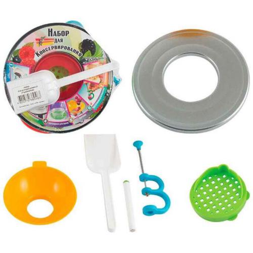 Наборы представлены в нескольких вариантов комплектов: из 5-ти, 6-ти или 7-ми предметов. Один из наборов упакован в презентабельную подарочную коробку, на которой представлена вся необходимая информация о самих товарах консервирования и их использовании.